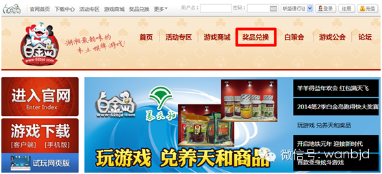 登陆白金岛官方网站http://www.52bjd.com/,点击“奖品兑换”按钮【红框】。如下图: